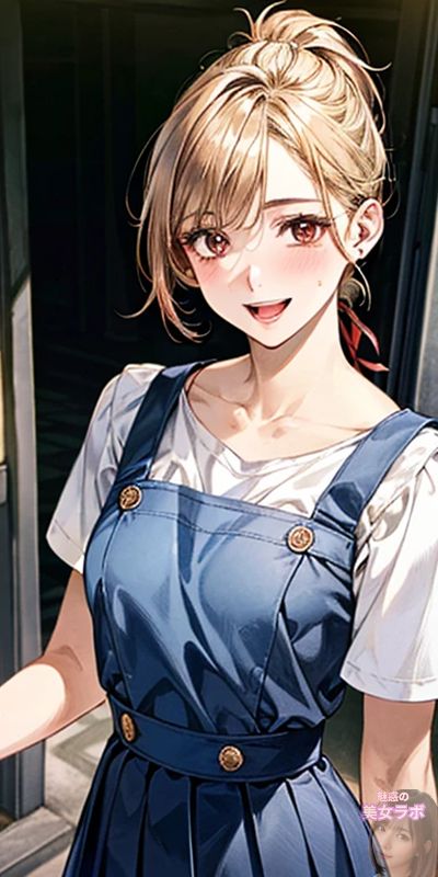 画像1: 青いジャンパースカートと白いシャツを着た笑顔のアニメ風日本人女性のイラスト。