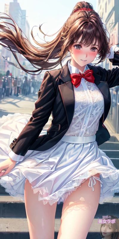 画像11: 白いレースのブラウスとスカート、黒いジャケットを着たアニメ風日本人女性が風でスカートが舞い上がるイラスト。