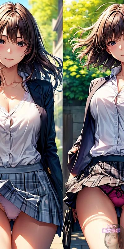 画像4: 学生服を着たアニメ風日本人女性が風でスカートがめくれるシーンのイラスト。