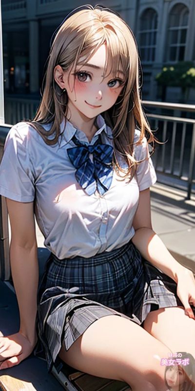 画像6: 制服姿のアニメ風日本人女性が外で座って微笑んでいるイラスト。