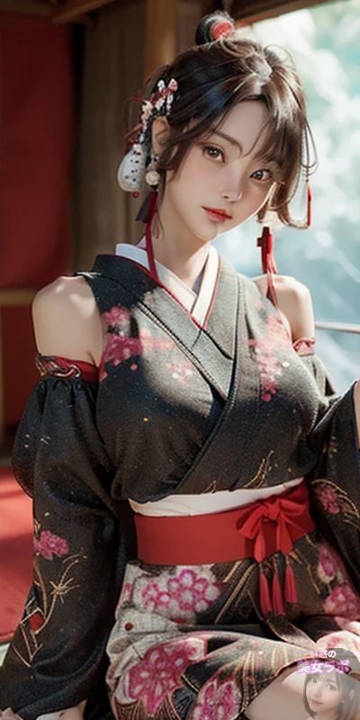 画像9: 黒い着物を着たアニメ風日本人女性が室内でポーズをとっているイラスト。