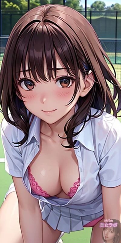 画像10: テニスコートで制服を着たアニメ風日本人女性が前屈みでポーズをとっているイラスト。