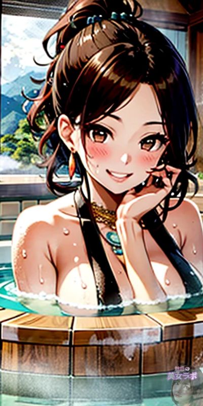 画像14: 温泉で水着を着たアニメ風日本人女性が笑顔でポーズをとっているイラスト。