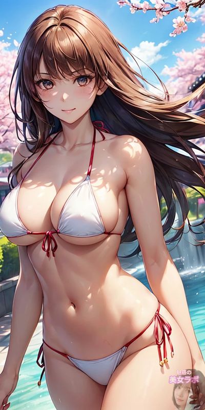 画像15: 白いビキニを着たアニメ風日本人女性が桜の背景でポーズをとっているイラスト。