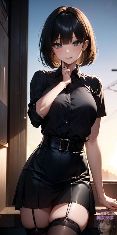 画像1: 黒いシャツを着たセクシーなアニメ風美女が外でポーズを取る。