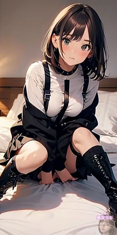 画像5: ベッドの上で黒いブーツを履いたセクシーなアニメ風美女。