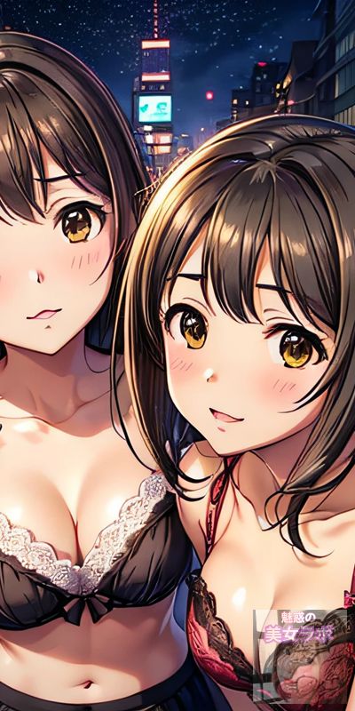 画像10: ランジェリー姿のセクシーなアニメ風美女二人が夜の街でポーズを取る。