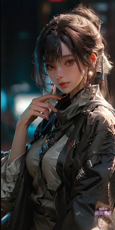 画像4: 未来的な都市を背景にした彼女は、サイバーパンクな雰囲気を持つキャラクターです。クールな表情が魅力的です。