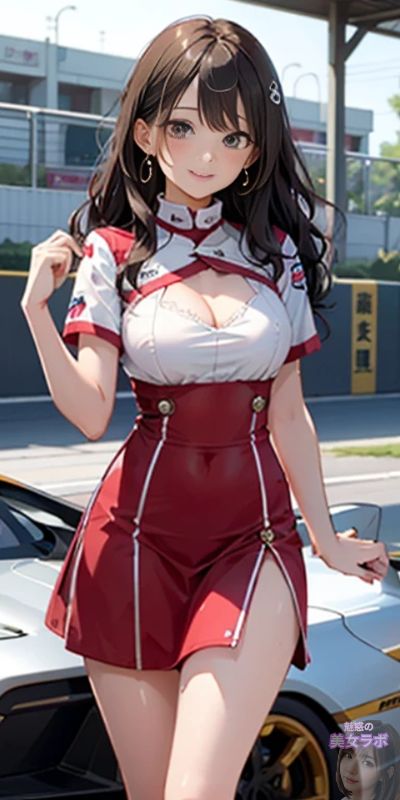 画像11: スポーツカーの前に立つ彼女は、スピードとスリルを求めるキャラクターです。そのクールな笑顔が魅力です。