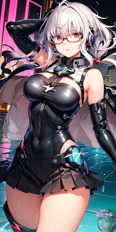 画像4: 未来的な都市を背景にした彼女は、サイバーパンクな雰囲気を持つキャラクターです。クールな表情が魅力的です。