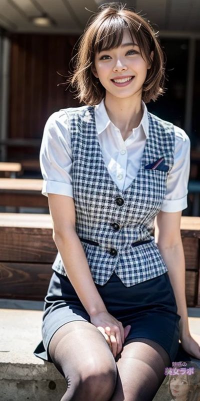 画像2: 制服姿の笑顔の日本人女性が屋外でベンチに座っている写真。