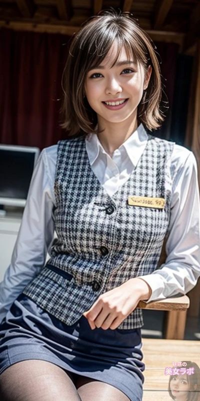 画像1: 制服姿の笑顔の日本人女性がベンチに座っている写真。