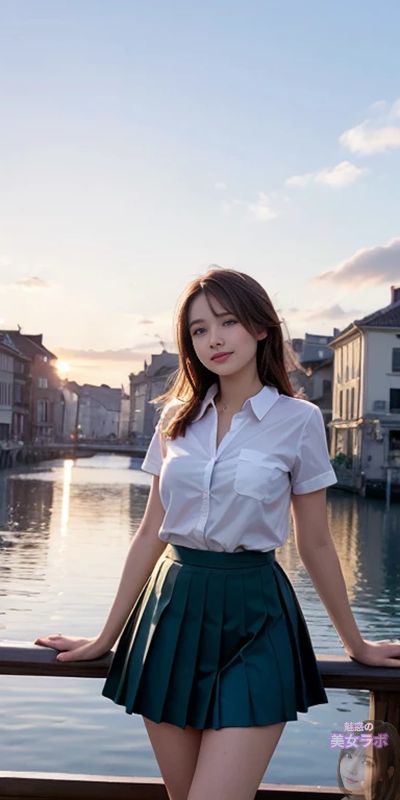 画像5: 川辺で制服姿の日本人女性が夕焼けの中ポーズをとる写真。