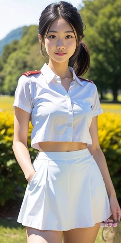 画像9: 白いクロップトップとスカートを着た日本人女性が屋外でポーズをとる写真。