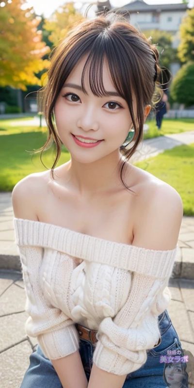 画像1: 公園でオフショルダーの白いセーターを着た日本人女性が微笑んでいる写真。