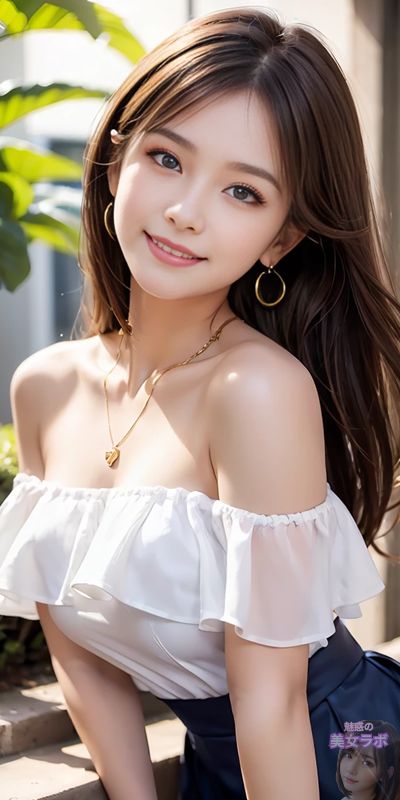 画像4: 白いオフショルダートップスを着た日本人女性が屋外で微笑んでいる写真。