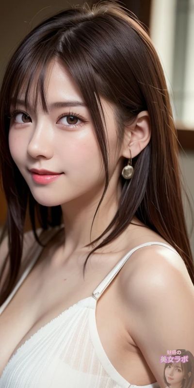 画像8: 白いキャミソールを着たロングヘアの日本人女性が室内で微笑んでいる写真。