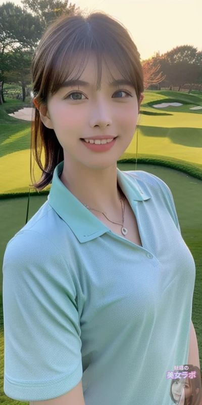 画像12: ゴルフ場でポロシャツを着た日本人女性が微笑んでいる写真。