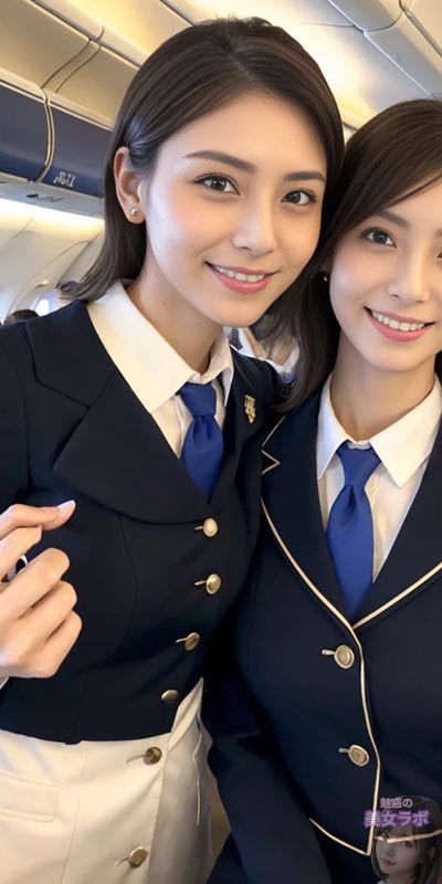 画像15: 飛行機内で制服を着た2人の日本人女性が微笑んでいる写真。
