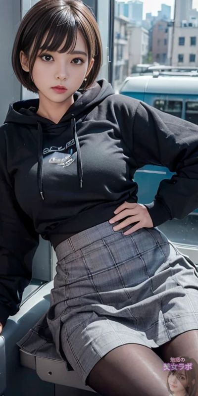 画像1: 窓際で座っているショートカットの日本人女性、黒いパーカーとチェックのスカートを着用