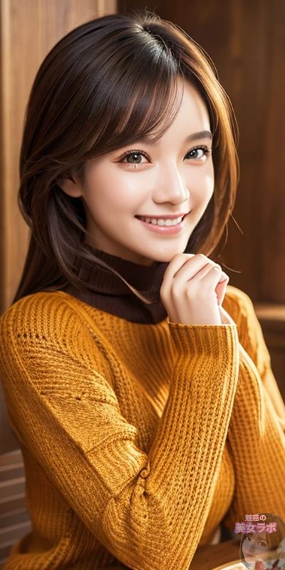 画像2: 微笑む日本人女性、オレンジのセーターを着ている