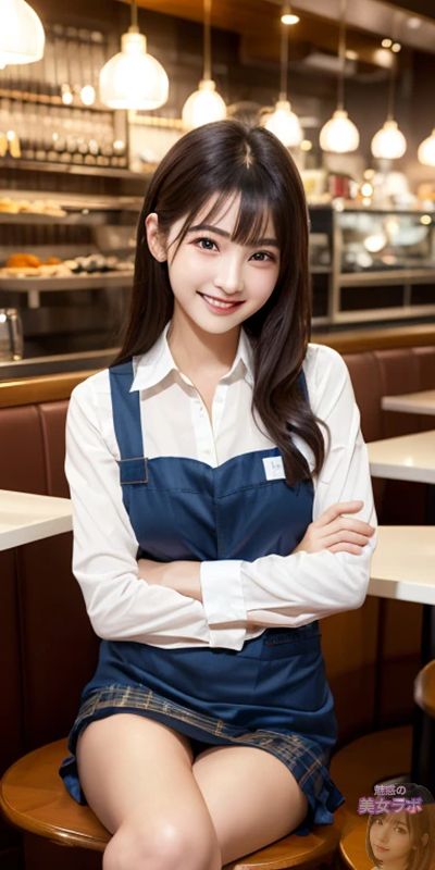 画像6: カフェで働く日本人女性、白いブラウスと青いエプロンを着用