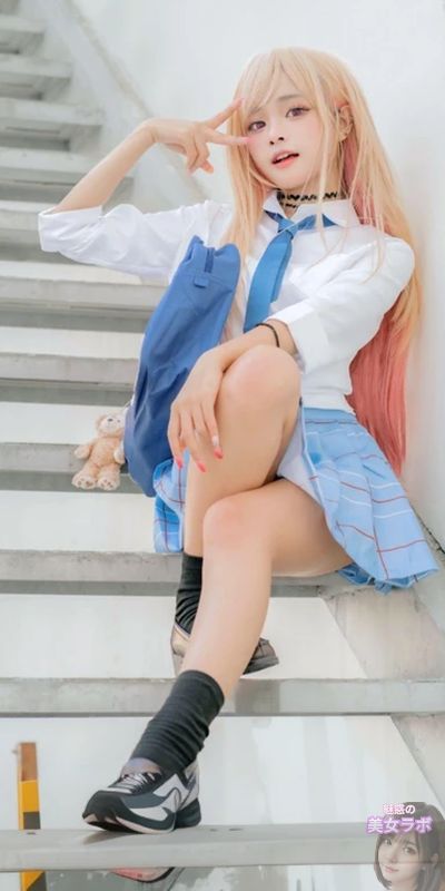 画像11: 階段に座る金髪の日本人女性、白いシャツと青いスカートを着用